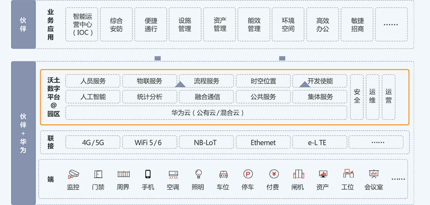 长泰智慧园区解决方案依托华为产品组合,基于公有云,联合生态伙伴,解决客户问题。以沃土数字平台打造智慧园区数字底座,实现南向连接标准化,北向应用服务化。